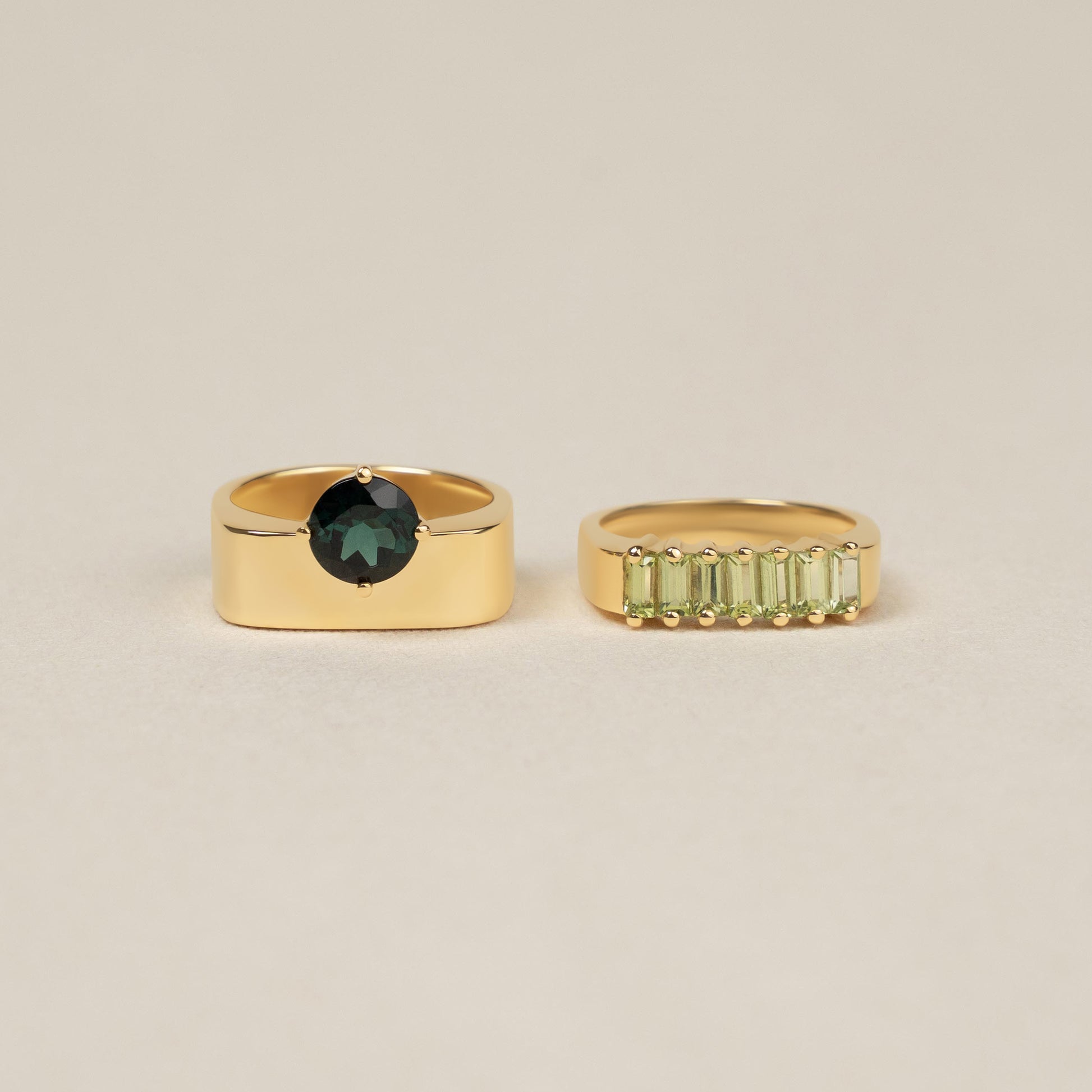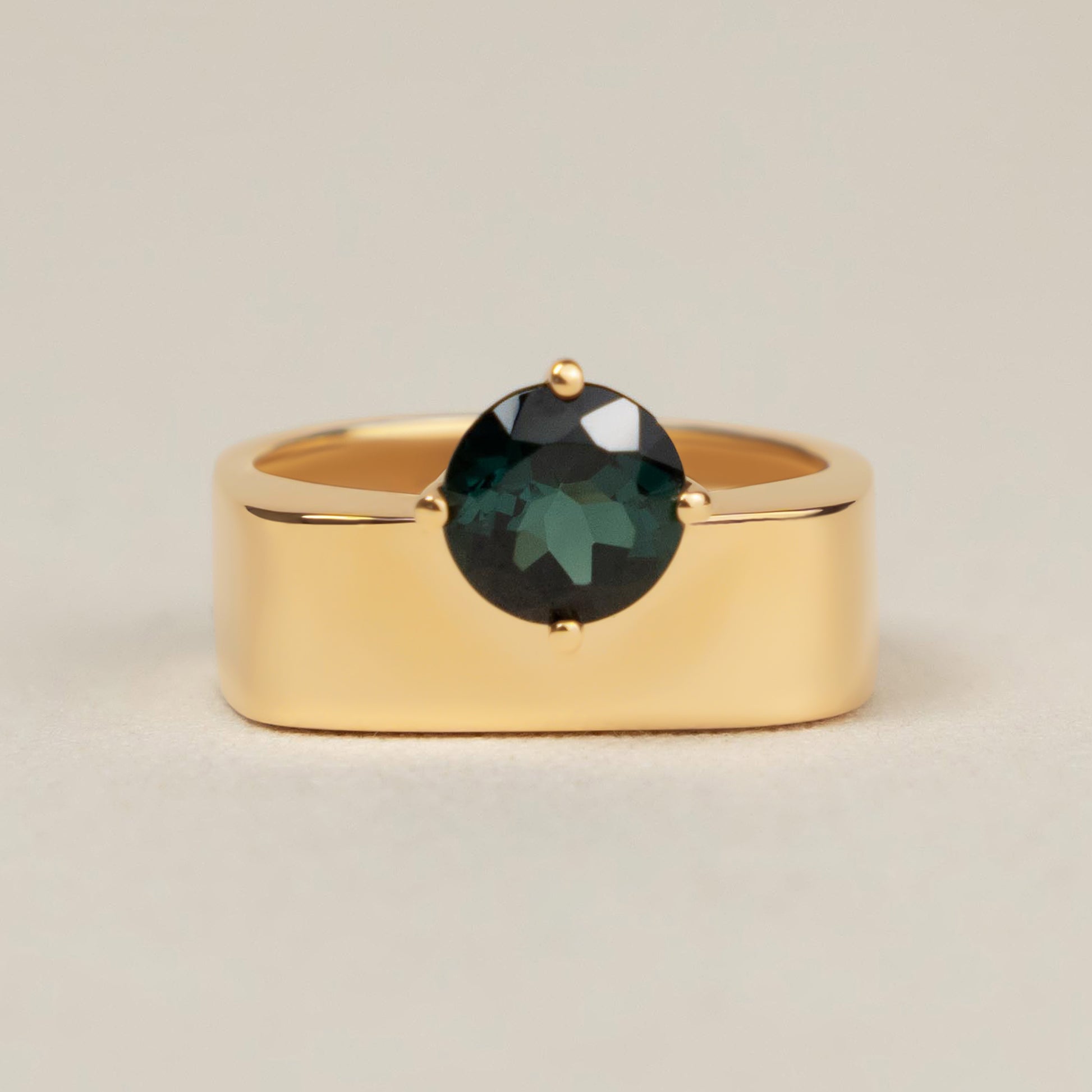 This ring features a round green Tourmaline (7 mm), set in 18k yellow gold. Ring band width 6 mm.